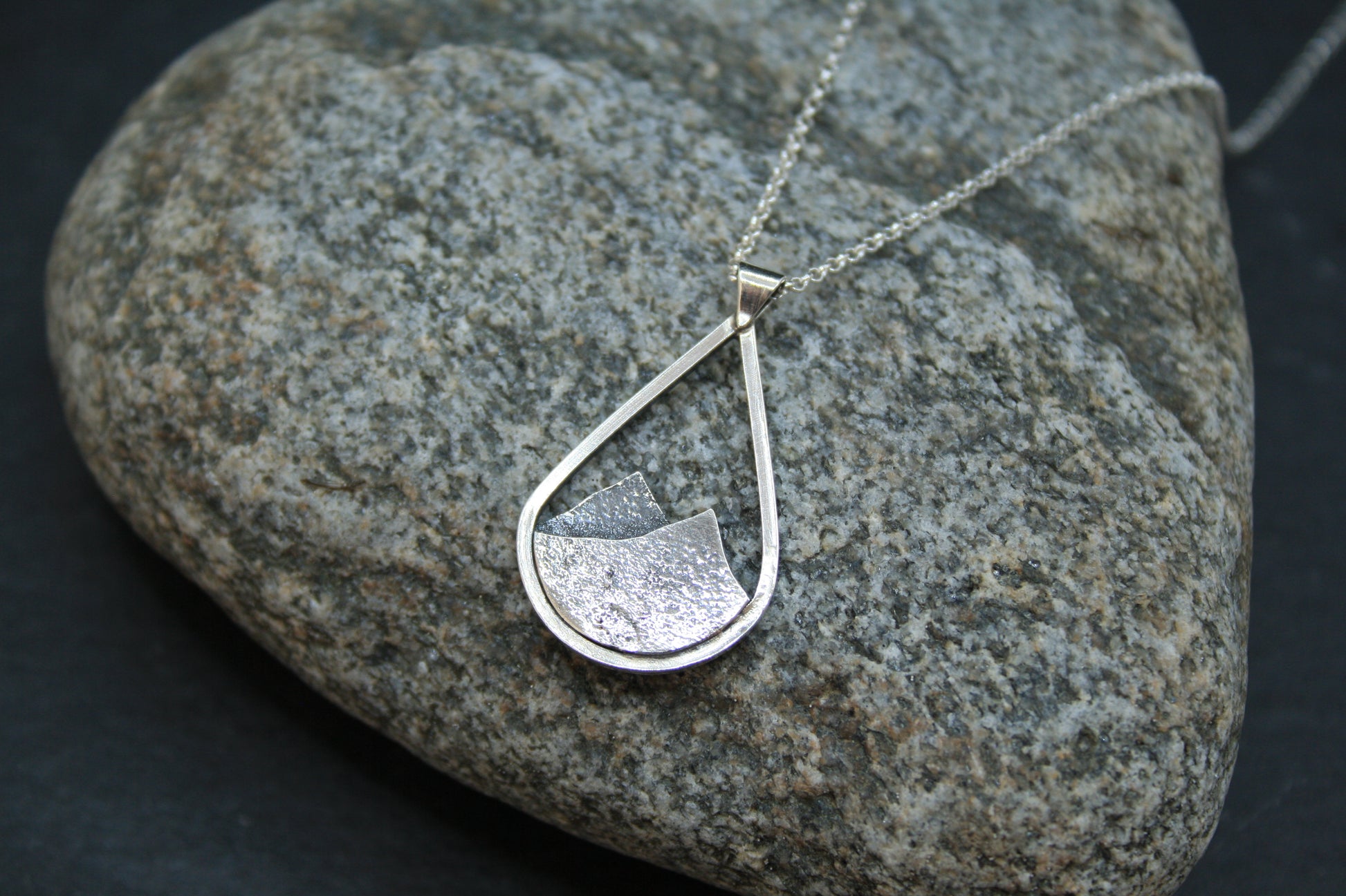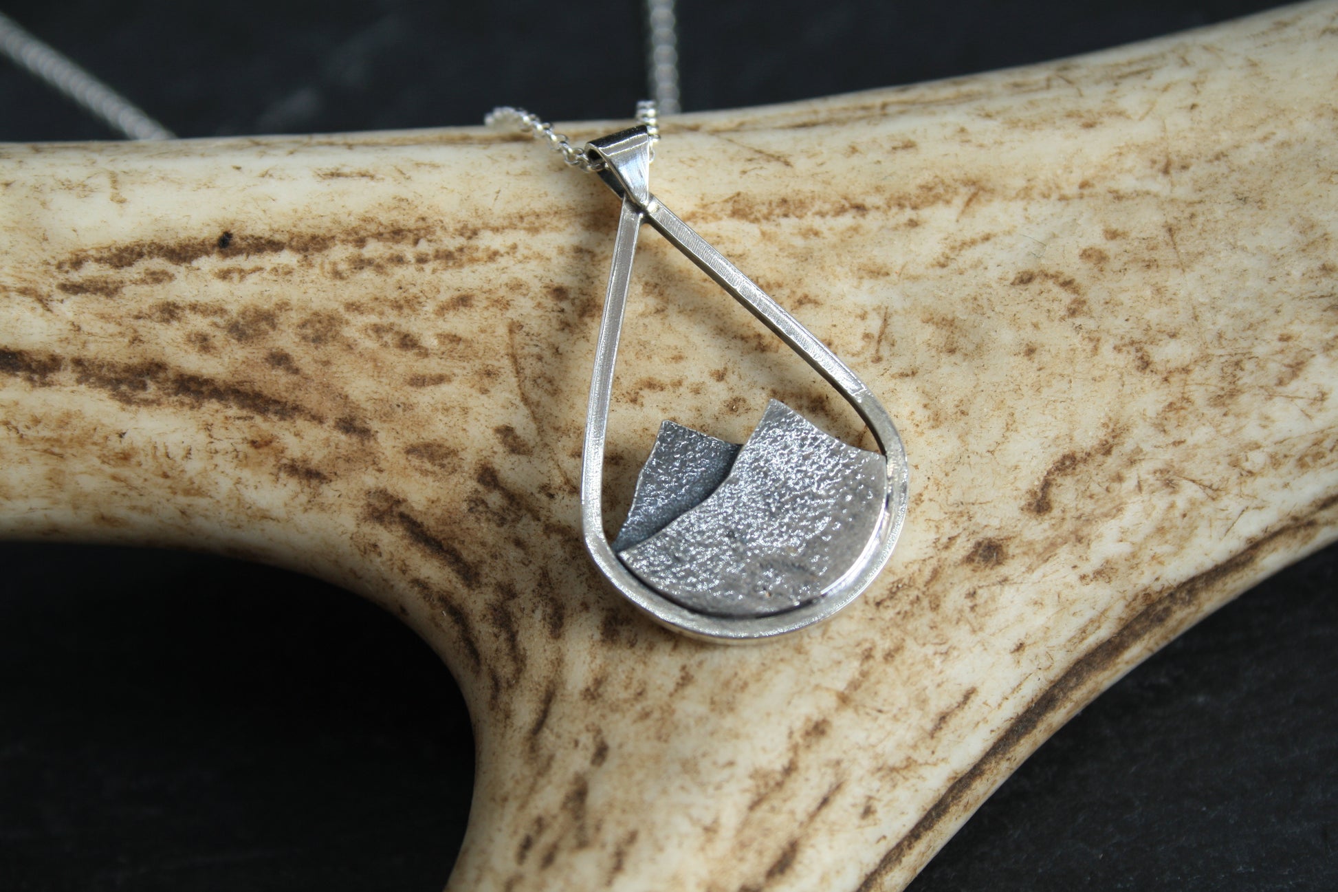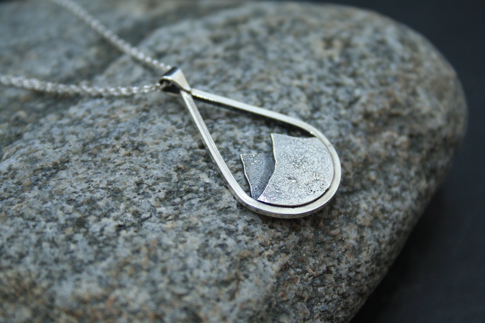 This uniquely handcrafted mountain range pendant features two layered mountains which have been individually sawn. I have textured the surfaces through reticulation, a process which involves heating the silver to melt the top layer. This creates a lovely texture. I have then oxidised the piece to emphasise this texture and the depth of the pendant. The teardrop surround is made from 1mm square wire.
