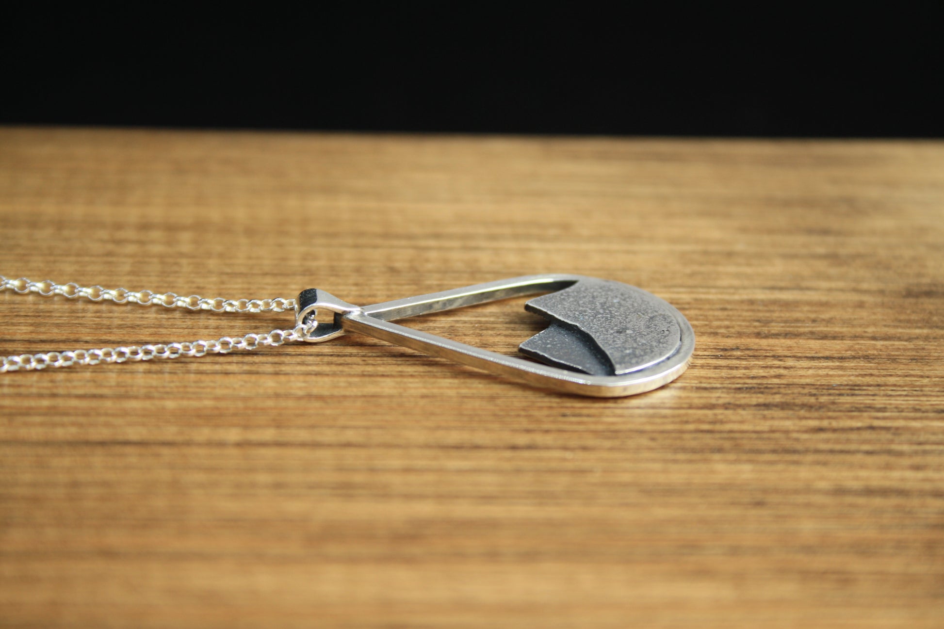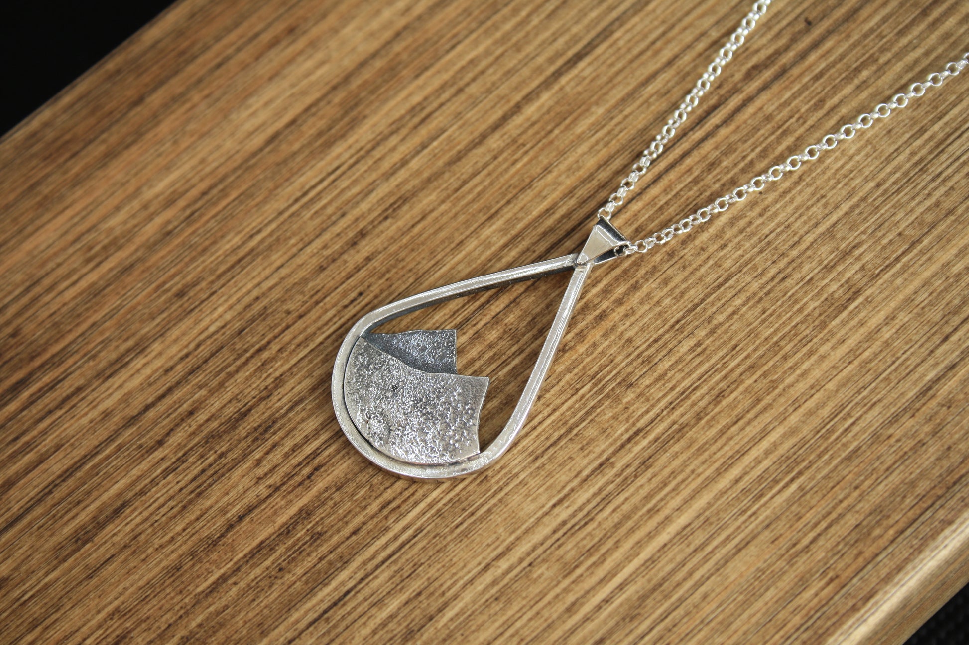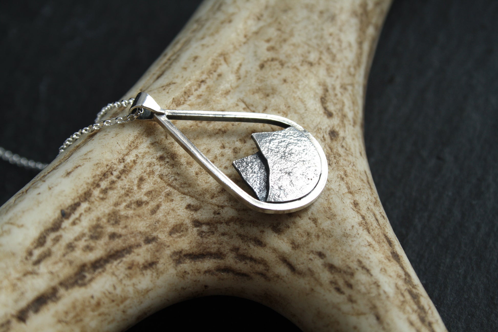 This uniquely handcrafted mountain range pendant features two layered mountains which have been individually sawn. I have textured the surfaces through reticulation, a process which involves heating the silver to melt the top layer. This creates a lovely texture. I have then oxidised the piece to emphasise this texture and the depth of the pendant. The teardrop surround is made from 1mm square wire.